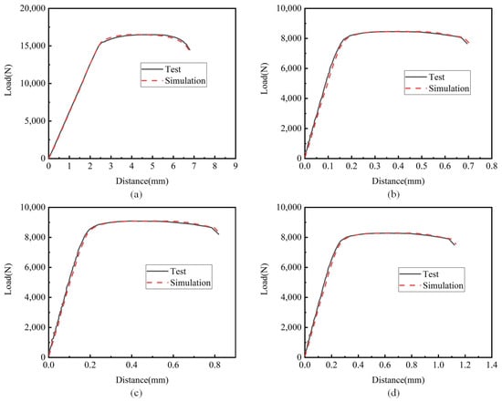 The load–displacement curve obtained by simulation was compared with the load–displacement curve obtained from the test, as shown in Figure 12, which shows the load–displacement curve under different notches. The curves obtained by simulation and the test coincided well, further confirming the reliability of the Johnson–Cook constitutive model parameters and damage parameters of TC4 titanium alloy fitted in this paper at room temperature.