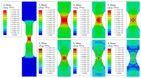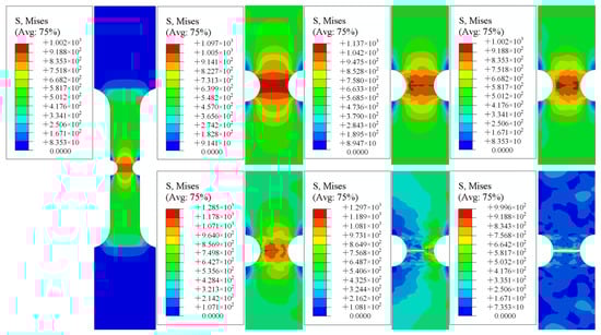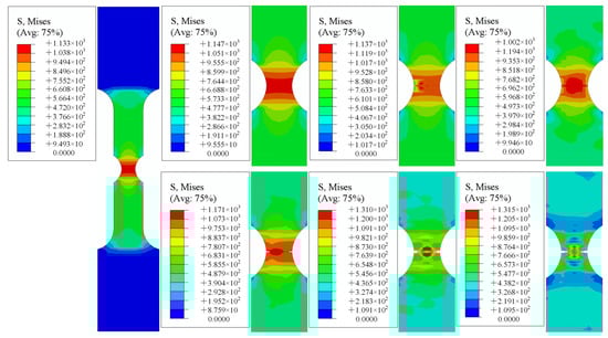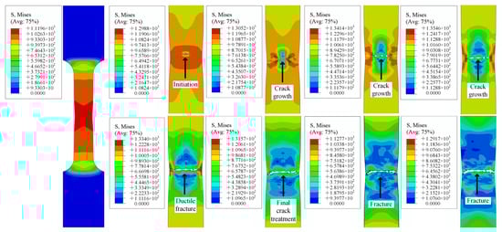 - Through the finite element simulation of the test specimen, the whole process from crack initiation to specimen fracture was obtained. The crack in the smooth specimen was first generated in the center. With continuous accumulation of plastic strain, the crack expanded to both sides until the specimen was broken. The cracks in notched specimens were generated from both sides and extended to the middle until the specimens were broken.