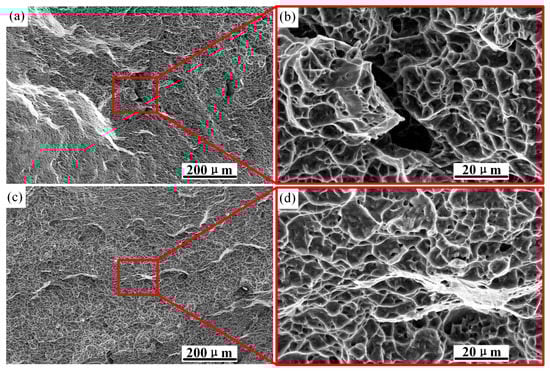 Figure 19 shows the fracture morphology of the smooth specimen at 500 and 4000x magnification. It was covered with dimples of different sizes, which were caused by the initiation and coalescence of micropores. Obvious traces of plastic deformation could also be observed, and some areas clearly showed characteristics of metal tearing. Figure 19b,d show partial enlarged views at strain rates of 0.001 s−1 and 0.01 s−1, respectively. It is obvious that the dimples in Figure 19b are deep and dense. The tensile strength and elongation of the material at different strain rates obtained by tensile tests of the smooth specimen are shown in Table 5. It can be seen that with the increase in strain rate, the tensile strength of the material increases, while the elongation after fracture is the opposite, and the increase in strength is accompanied by a decrease in ductility. Therefore, high density and deep dimples represent high elongation.