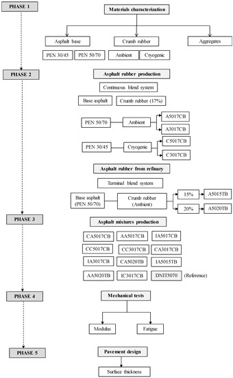 The experimental program comprised production of asphalt rubber mixtures and their mechanical testing (modulus and fatigue). The operation program comprised five phases detailed in the method flowchart (Figure 1).