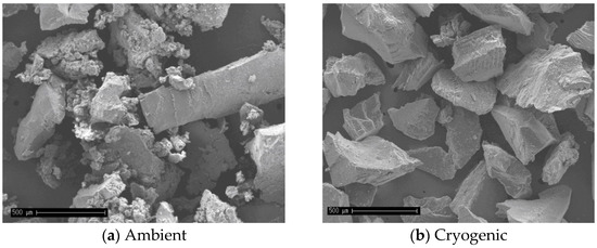 Scanning electron microscopy (SEM) images (magnified 50 times) are presented in Figure 3. The ambient rubber particles (Figure 3a) present a spongy aspect, and an irregular structures of different sizes with formation of agglomerates (smaller particles adhering amongst themselves). In contrast, the cryogenically prepared sample (Figure 3b) presents smooth, cracked surfaces with angular corners. The aspects of the crumb rubber were similar to observations in research studies conducted by other authors [12,13].