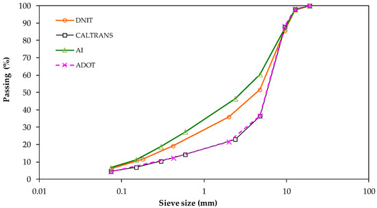 The gap-graded asphalt rubber mixtures followed the California Department of Transportation [38] and the Arizona Department of Transportation [39] standards, while the dense-graded mixture was designed to the Asphalt Institute mix type IV standard [40]. All mixtures were designed by the Marshall method.