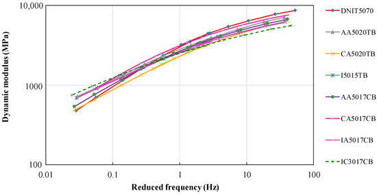 Figure 5 presents the master curves of the dynamic modulus for the reference temperature of 20 °C. From the master curves, it was possible to observe significant differences between all mixtures at low and highly reduced frequencies. Four asphalt rubber mixtures were tested at only one temperature, for which the master curves are not presented. Comparative to the reference, asphalt rubber mixtures presented a lower dynamic modulus at high frequencies and low temperatures, while the modulus was elevated at low frequencies and high temperatures.