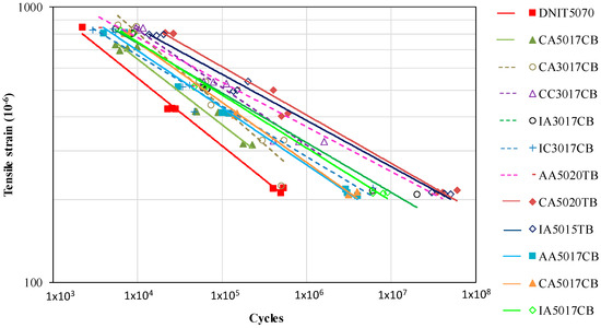 Fatigue life curves were drawn to define the fatigue laws (a linear relationship between the loading cycles and the tensile strain, plotted in the log) according to Equation (1). The parameters of these fatigue laws are presented in Table 10. The number of cycles for the 100 × 10−6 mm/mm strain level (N100) was also obtained for use as a comparison parameter. The comparison using the N100 parameter (Table 10) showed that the fatigue life of the asphalt rubber mixtures, for 100 × 10−6 mm/mm, ranged from 1.66 × 107 to 2.60 × 109 (155 times), meaning that the design’s parameters affected and were responsible for the fatigue performance of these mixtures.