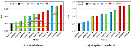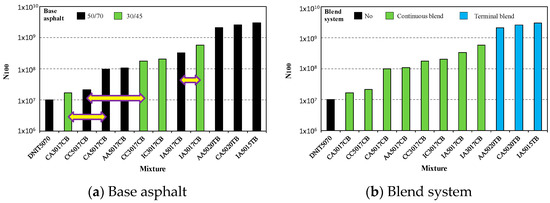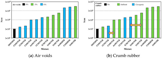 Figure 7, Figure 8 and Figure 9 present how the fatigue resistance (N100) is influenced by the design parameters of the asphalt rubber mixtures, such as base asphalt, crumb rubber type, gradation, volumetric parameters, and the production system. In these figures, horizontal arrows indicate the comparisons for identifying the influence of design parameters on fatigue resistance.
