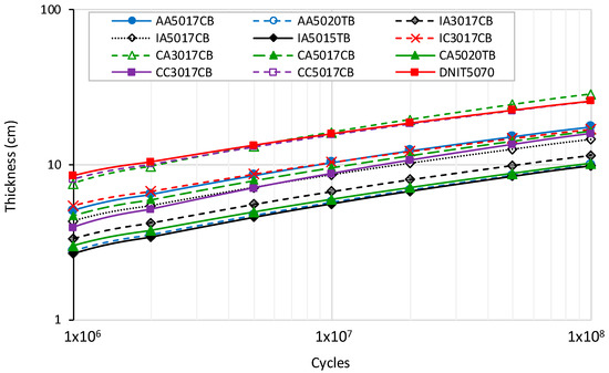 As a result, the best approximations for the coefficients and the R2 values are presented in Table 11. Figure 10 illustrates the pavement thickness as a function of the traffic level for the studied mixtures. As expected, the asphalt rubber mixtures presented superior performance than the reference (DNIT 50/70), except for CA3017CB and CC5017CB mixtures for traffic greater than 1 × 107 ESALs. For traffic less than 1 × 107 ESALs, these two mixtures were found to require almost the same thickness as the reference mixture.