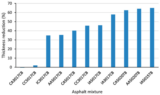 For the studied mixtures, the thickness of the surface layer was calculated, and the reduction in the pavement structure’s total thickness can be considered a benefit with respect to sustainability. The average thickness of the surface layer was considered for three traffic levels (106, 107, and 108 ESALs), and reductions from 50% up to 65% were observed (Figure 11) compared with the reference mixture. This alternative represents a substantial decrease in the cost of pavement construction and raw materials required to provide the same pavement life.