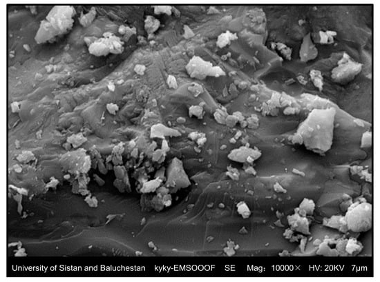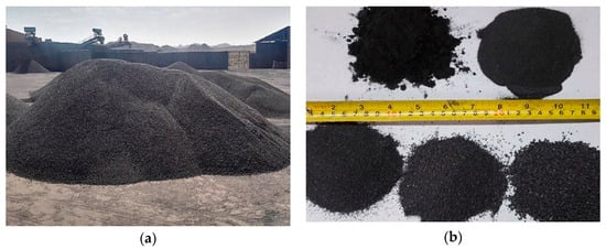 CS is a smooth glassy by-product formed during copper pyrometallurgy (Figure 1). Depending on the cooling pattern, CS can be divided into natural cooling slag and water-quenched cooling slag. Due to different processes, CS can differ in appearance, form, and density. Naturally cooled CS is black, a glassy appearance, and most of it is dense and lumpy, brittle, and hard. The density of CS varies as the iron content changes, typically from 2.8 to 3.8 g/cm3. The water quenching slag cooled by water flushing at high temperature is small black particles and porous, and a small part of it is flaky and needle-like. Its packing density is 1.6–2.3 g/cm3 [,,]. Figure 2 is a physical view of CS before and after grinding. Figure 3 is the SEM morphology of CS. Owning low water absorption of CS, it is quite obvious that CS will observe more water when compared to quartz sand []. CS requires less water than sand in CBMs. The wearing performs of CS is well, and the wearing-coefficient is about twice as high as that of standard sand []. The bulk density of CS is directly proportional to the content of Fe2O3, with a correlation coefficient of 0.94 [].