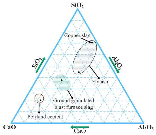 CS is mainly composed of Fe2O3, SiO2, and a small number of metallic elements such as calcium, magnesium, aluminum, copper, and harmful elements such as sulfur [,,]. The chemical composition of typical CS in different regions is shown in Table 1. The chemical composition of activated CS is close to the slag composition [,]. Figure 4 is the chemical compositions of original CS in the CaO-SiO2-Al2O3 system []. CS is an amorphous vitreous body composed of fayalite (2FeO·SiO2), magnetite (Fe3O4), sulfide, and some gangue components [,,,]. Through SEM-EDS-MLA combined analysis, Sarfo et al. [] found that the contents of Fe1.2Ca0.5Al0.3SiO4 and Fe2SiO4 in CS were as high as 84%, followed by Fe3O4 accounting for 11.41%, and sulfide accounted for less.