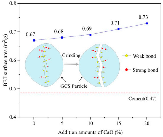 Weak bonds selective breaking in particles of GCS during grinding and GCS BET surface area of as a function of the addition amount of CaO [].