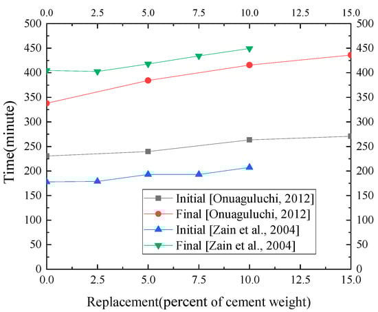 When CS is used as SCMs, it delays the setting time of CBMs [,,,]. Figure 8 shows the initial setting time and final setting time of CBMs after CS displacing different proportions of cementitious materials. It can be observed that with the increasing of CS content, the setting time also increasing. When CS is used as a fine aggregate, the effect of CS of different particle sizes on the setting time of CBMs is different []. Ayano et al. [] considered that the smaller the particle size of CS, the longer the setting time delay. However, the effect of CS on setting time can be reduced by washing insoluble residues on the CS surface, and the more times of washing, the smaller the effect. Resende et al. [] found that when CS acts as fine aggregate to replace sand in mortar almost double delays the initial setting time and final setting time with the CS content ratio increasing. Lye et al. [] concluded that the delayed setting time properties of CS in CBMs are favorable for concrete pouring in hot weather.