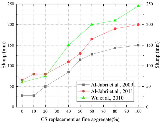 Most studies suggest that when CS replaces fine aggregate or coarse aggregate, a certain amount of CS can enhance the workability of CBMs, but excessive CS can cause bleeding [,,]. As shown in Figure 9, slump of fresh CBMs significantly increased with the increase in CS content. This is attributed to CS surface being much smoother than sand, thereby improving fluidity of CBMs. In addition, the glassy surface of CS showed lower absorption, which led to more free water can act as a lubricant between solid particles [,]. It should be noted that when CS content is higher than 80%, fresh CBMs show bleeding and segregation phenomena, which are detrimental to the properties of CBMs [,]. Shoya et al. [] and Kumar B et al. [] suggested the sand replacement rate of CS to be less than 40% to control the bleeding rate of fresh CBMs. In contrast to the above, Resende et al. [] concluded that replacing the sand with CS reduced the collapse degree of the mixture, although slump remained within a reasonable range.