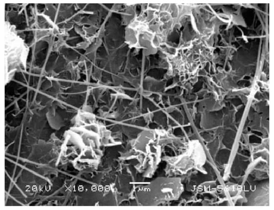 When CS is used as SCMs, CS in most cases causes a decrease in the early compressive strength of CBMs, but the adverse effect of CS on compressive strength gradually diminishes with age, and this adverse effect can be mitigated by the addition of activator [,]. Active components such as silicate and aluminate can also be exposed by grinding to destroy the vitreous in CS to accelerate the early hydration reaction, thereby improving the early strength of CBMs []. The addition of CS allows the gap of CBMs to be filled to form a dense network structure, which is beneficial to improve the strength, as shown in Figure 10. However, when CS is used as SCMs, too high content of CS reduces the compressive strength of CBMs, and there is an optimal content. Bharath et al. [] found that the concrete compressive strength was slightly increased when CS was substituted for 15% cement, and the compressive strength of the remaining CS mixture ratio study groups was lower than that of the 100% cement reference group. Tixier et al. [] and Mobasher et al. [] drew that replacing 15% cement with CS and adding 1.5% slaked lime as an activator improved the compressive strength of concrete most significantly. Edwin et al. [] concluded that in mortar replacing cement with 10% CS was a more appropriate ratio to improve the strength of mortar. If CS is present in too high amounts, it delays the hydration reaction, which is due to limited volcanic ash activity of CS and heavy metal compounds such as zinc in CS. In addition, different water–cement ratios can affect the compressive strength of CBMs of CS with the same amount. Moura et al. [] concluded that the 28-day compressive strength of concrete with 20% CS content was improved by 2.3%, 23.8%, and 30.4% with water–cement ratios of 0.4, 0.5, and 0.6, respectively.