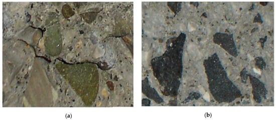 CS may also serve as a coarse aggregate to improve the compressive strength of CBMs. Khanzadi and Behnood [] concluded that CS incorporated into concrete as a coarse aggregate substitute for limestone improved the compressive strength of concrete by 12.9% at 91 days. This is due to the strength properties of the CS coarse aggregate. It is also attributed to the better adhesion of CS coarse aggregate and cement paste. As shown in Figure 11, CS coarse aggregate creates a better adhesive transition zone attribute to its porous and rough surface texture compared to limestone coarse aggregate.
