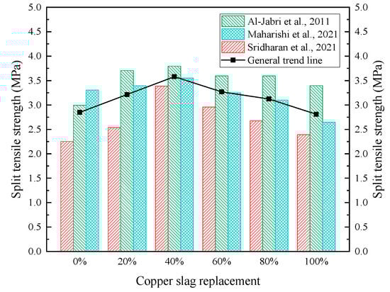 Most studies consider split tensile strength favorable when a certain amount of CS is added to CBMs as SCMs. At a water–cement ratio of 0.5, replacing 15% of cement with CS can significantly improve the split tensile strength of CBMs [,]. CS as fine aggregate also increases split tensile strength of CBMs []. It can be found from Figure 12 that the optimal content generally occurs at 40% when CS replaces fine aggregate [,,]. In addition, CS can be used as a coarse aggregate to improve split tensile strength of CBMs due to the stronger binding between the CS coarse aggregate and cement paste. Split tensile strength of concrete with all coarse aggregates being CS can be more than 10% higher than that of limestone concrete [].