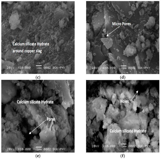 SEM micrographs of concrete with different proportions of CS at 28 days: (a) 0% CS + 100% sand; (b) 20% CS + 80% sand; (c) 40% CS + 60% sand; (d) 60% CS + 40% sand; (e) 80% CS + 20% sand; (f) 100% CS [].