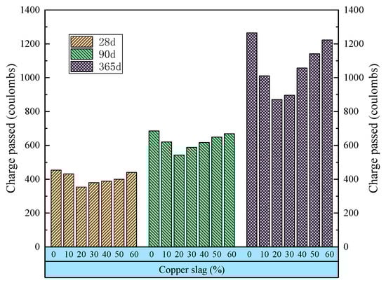 Most studies consider chloride penetration unfavorable when a certain amount of CS is added to CBMs as SCMs. Replacing 10% of cement with CS has the best effect on reducing chloride penetration, and the effect of CS on reducing chloride permeability is more pronounced at later stages [,].