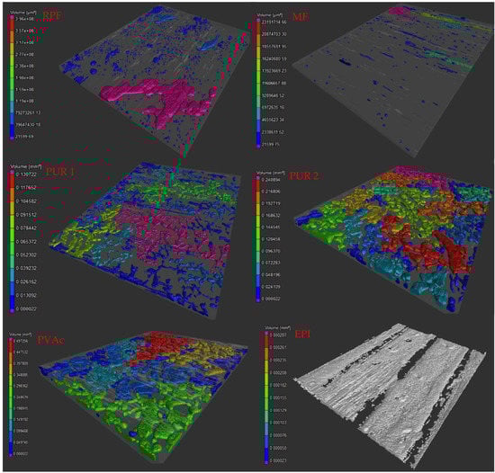 The voids are illustrated in Figure 3. The adhesive covers the whole bonded area, but in the joint, there were gaps, which are displayed on the figures. The size of the gaps is determined by the use of the colors displayed. The biggest voids are pink and the smallest are blue.