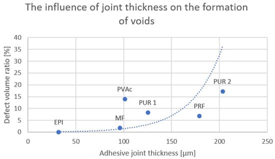 It has been proven that the thickness of the adhesive joint and the type of adhesive have a large influence on the formation of voids in the adhesive joint. This has a significant impact on the final strength of the glued elements. Following the analysis of the results, it is recommended to achieve a joint thickness in the range of 100–150 µm for the appropriate application of the adhesive.