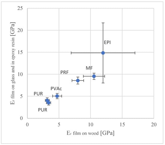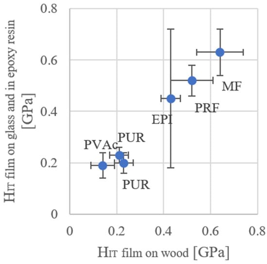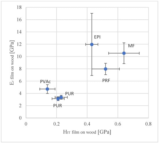 In the case of the elastic modulus, the method (adhesive layer on glass) showed also for the variant EPI, a much bigger spread. For this reason, the comparison of hardness and the elastic modulus was made, using the second method (adhesive on the wood)—Figure 6 and Figure 7.