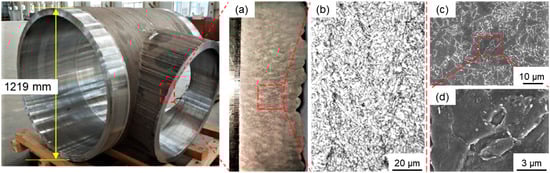Figure 5 shows the morphologies of microstructures on the vertical section of deposits of the SAAM workpieces. Figure 5a displays the macroscopic morphology of samples and the sampling position is shown in Figure 1. Figure 5b illustrates the metallographic microstructures in deposits of the SAAM high-strength low-alloy steel workpieces. The bright white area is found to have a large number of polygonal ferrites, which are generally formed at a high transformation temperature and a slow cooling rate. Previous research has shown that the structure nucleates at the original austenite grain boundary in priority and its growth can cross such a boundary, thus covering the outline of original austenite grain boundaries [18]. Figure 5c shows the morphology of microstructures in deposits of SAAM high-strength low-alloy steel workpieces under the SEM. In the figure, polygonal ferrites are dark gray, the white grain boundaries seem like interlaced networks, and polygonal ferrites with the size of 6~15 μm have regular and smooth boundaries. Figure 5d is a locally enlarged picture of Figure 5, in which white blocky pearlites can be found in local areas.
