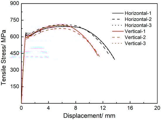 The horizontal (X) and vertical (Y) tensile curves of the high-strength low-alloy steel T-branch pipe prepared through SAAM are illustrated in Figure 6. The test results show that the tensile strengths of the deposits in the horizontal (X) and vertical (Y) directions are separately 705 and 695 MPa. The elongation rates of samples in the two directions are calculated and the elongations at the break of the deposits in the horizontal (X) and vertical (Y) directions are 27% and 22%, respectively. The result indicates that the tensile strengths differ slightly in the two directions, while the plasticity of the deposits in the vertical direction is weaker than that in the horizontal direction.