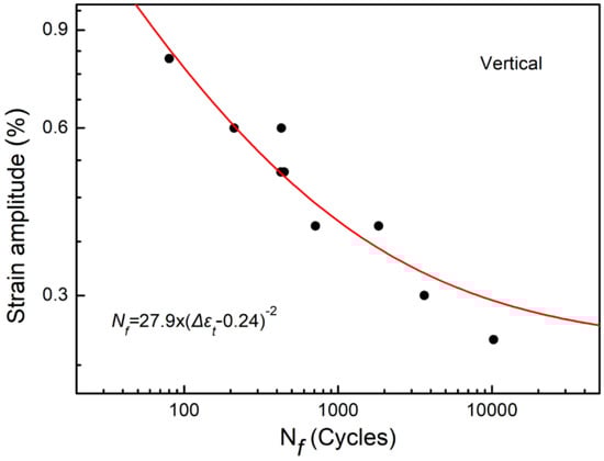 The Zheng-Hirt formula is used to fit the data of low-cycle fatigue tests of SAAM high-strength low-alloy steel workpieces and the fatigue curves are shown in Figure 7. In this way, the fitting equation with the strain fatigue limit is obtained, as expressed below: