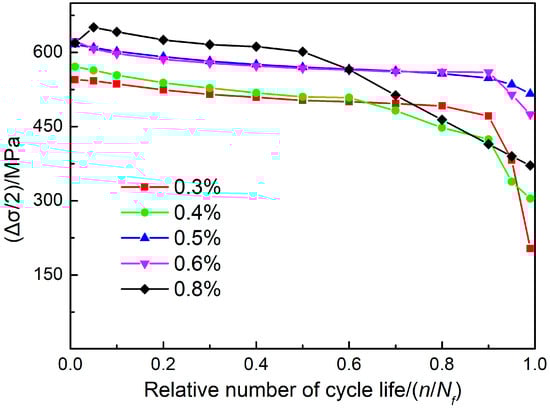 Changes in the amplitude of tensile stress of SAAM high-strength low-alloy steel workpieces under different strain amplitudes are illustrated in Figure 8. The samples all show fatigue characteristics of cyclic softening in the low-cycle fatigue tests. At first, the amplitude of tensile stress corresponding to the initial life cycles (10% of the total life cycles) may reduce under all strain amplitudes, except for the maximum strain amplitude of 0.8%. Then, the amplitude of tensile stress decreases slowly in 80% of total life cycles after reaching a stable number of cycles. Finally, the amplitude of tensile stress decreases abruptly in the remaining 10% of total life cycles until the failure of samples [19].