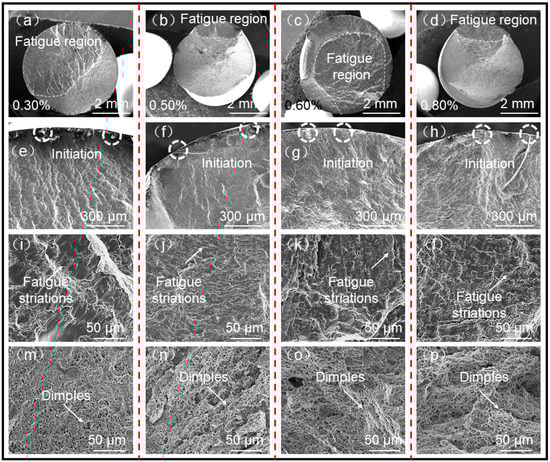 Figure 9 illustrates the morphologies of low-cycle fatigue fractures of SAAM high-strength low-alloy steel workpieces under different strain amplitudes. Figure 9a–d separately show the macroscopic morphologies of fatigue fractures under strain amplitudes of 0.3%, 0.5%, 0.6%, and 0.8%, and no defects such as macropores and inclusions are found in macroscopic morphologies of joints. The fractures are mainly divided into two characteristic regions: the upper part is the fatigue region, which is smooth, and the remaining is the final tensile fracture region. Figure 9e–h display the initiation positions of fatigue cracks in samples under various strain amplitudes, in which circles mark the initiation sources of fatigue cracks. Fatigue cracks in the two circles in each figure both initiate from the sample surfaces. The SAAM high-strength low-alloy steel workpieces show multi-source crack initiation characteristics in the process of low-cycle fatigue tests [20]. Figure 9i–l display the fatigue crack propagation regions in the SAAM high-strength low-alloy steel workpieces in the process of low-cycle fatigue tests. Obvious fatigue striations are found in these regions under each strain amplitude. Cracks are opened under cyclic tensile stress, while cracks destabilize under compressive stress in reverse loading, and grooves are formed at crack tips. Finally, new cracks are formed under the maximum cyclic compressive stress, while their length has increased [21]. After repeating in this way, cracks constantly propagate forward. Figure 9m–p shows the final tensile fracture regions of SAAM high-strength low-alloy steel workpieces, in which lots of dimples are observed, indicative of favorable ductility.