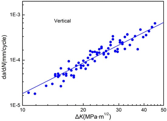 The relationship curve between the vertical fatigue crack propagation rate of deposits of SAAM workpieces and the stress intensity factor (SIF) amplitude ΔK is illustrated in Figure 10. The fatigue crack propagation rate and the SIF amplitude ΔK show a double-log linear relationship on the whole. As the SIF amplitude constantly grows, the vertical fatigue crack propagation rate of deposits continues to increase.