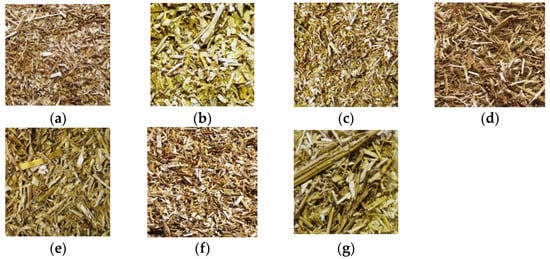 Rapeseed straws from: (a)—Marne 15-10, (b)—Marne15-20, (c)—Marne 16-10, (d)—Marne 16-20, (e)—Somme 16-10, (f)—Somme 16-20, (g)—Marne 16-20 Impact.