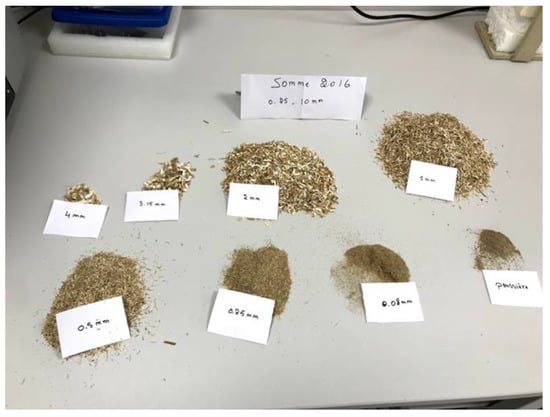 When dealing with lignocellulosic stalks, square-mesh sieves are of limited interest because they do not take into account the elongation of the aggregates [51]. Nevertheless, a separate examination of the sieves after the test reveals that the average length of the particles changes little overall. This is presented in Figure 8, where only the particle thickness and width allow conditioning the passage from one sieve to the other.