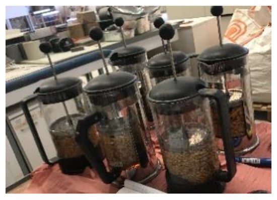 The amount of water absorbed by the plant aggregates gives an idea of the amount of pre-molding water required for concrete manufacturing. The water absorption of aggregates was measured with the coffee pot method recommended by Rilem [40]. This technique consists of weighing 20 g of dry or conditioned rapeseed straws at 23 °C and 50%RH and then dipping them in a coffee pot containing 500 mL of water under light pressure from a piston (Figure 4). The measurement of the mass of rapeseed straw was carried out outside the pot, after total immersion in water for 1 h. The ratio of absorbed water is calculated using the initial mass of rapeseed straw [40].