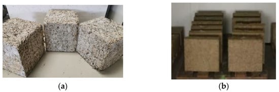Following formulation preparation, samples were stored in a curing chamber at 23 °C and 50%RH. According to the application, samples were molded into two distinct shapes. Figure 5a represents 15 cm × 15 cm × 15 cm mechanical test specimens, while Figure 5b depicts 25 cm × 25 cm × 8 cm thermal conductivity test specimens.