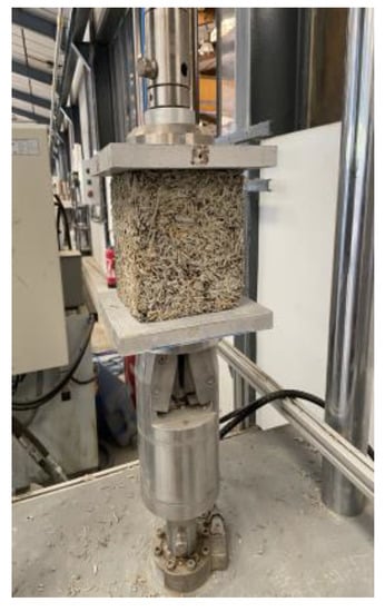 The mechanical properties of rapeseed concrete were investigated using the hydraulic servo-controlled compression testing machine (Figure 6) at a displacement rate of 0.02 mm/s according to NF EN 12390-2 [43] and NF EN 196-1 [44]. Tests on 15 cm × 15 cm × 15 cm samples (Figure 5a) were carried out after 28 days of curing. In this investigation, the mechanical tests are measured parallel to the direction of settlement. Four cubic samples per formulation are prepared for the compressive strength test with a settlement control based on the initial density of the samples (1200 kg/m3).