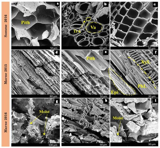 Figure 7 illustrates different parts of the rapeseed straws from the Somme and Marne. A cross-section of Somme straw harvested in 2016 allowed the identification of the pith (Pith) (Figure 7a), tracheid (trA) and vessels (Va) that act as water transporters (Figure 7b). The fiber bundle constitutes the phloem (PhL) (Figure 7c), vascular cambium and the xylem (Xyl), which is the set of vessels and tracheid, the vascular cambium responsible for radial growth of the stem. The pith (Pith) with its vessels in a longitudinal section of rapeseed straw from Marne 2015 can be seen in Figure 7d–f, as well as the epidermis (Epi), the most rigid part that covers the straw structure (Figure 7d,f), composed of the phloem (PhL) and the xylem (Xyl).