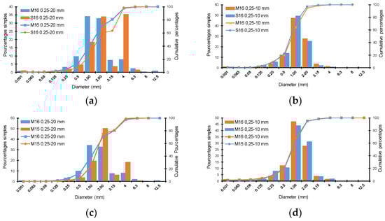 From a comparative point of view, the influence of climate is more significant on rapeseed straws with diameters ranging from 0.25 to 20 mm. For example, it can be seen in Figure 8a that the percentage of particles on the 6.3 mm sieve is 35% for S16, whereas it is only 10% for M16. The majority of M16 0.25–20 mm rapeseed straws have a width of 1–2 mm, while the majority of S16 0.25–20 mm straws have a width of 2–4 mm. This difference is not observed for straws ranging from 0.25 to 10 mm (Figure 8b). In terms of the harvest year, the influence is more noticeable on straws ranging from 0.25 to 20 mm (Figure 8c,d).