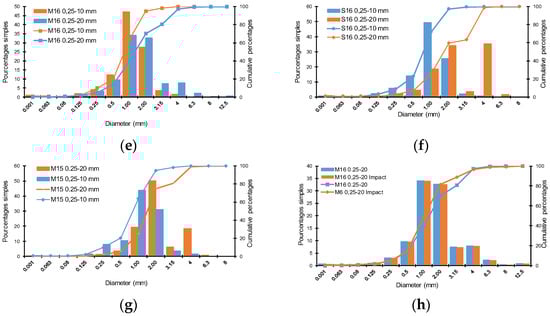 The influence of straw cutting size on the particle size distribution of rapeseed aggregates is visualized in Figure 8e–g. Straws with a diameter of between 0.25 and 10 mm typically have a width between 0.5 and 2 mm, while those with a diameter between 0.25 and 20 mm have a width between 1 and 4 mm. Concerning the type of aggregate crushing, Figure 8h reveals that the granular distribution of the M16–20 mm straws is similar for the two types of crushing (impact and shearing).