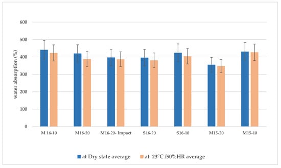 Figure 9 illustrates the maximum water content of various types of straw after drying and conditioning at 23 °C and 50%RH. Comparing the water absorption capacities of different cultures of rapeseed straws of the same size (M16-10, S16-10, and M15-10 or M16-20, S16-20, and M15-10), no significant differences can be observed. However, there is a slightly higher absorption capacity for rapeseed straws of 0.25–10 mm compared to those of 0.25–20 mm. This may be due to the higher dust content in the smaller aggregate batches.