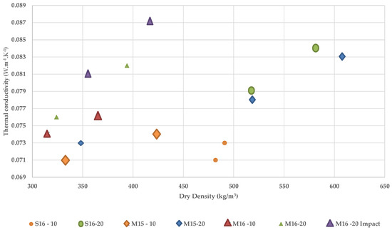 In addition, it can be seen that bulk density was largely dependent on aggregate size, with differences for each batch (M16, S16 and M15) in the order of 20 to 32 kg/m3. Thus, the samples with the 10 mm straw had a higher density in the order from 30 to 45%. This is due to the better arrangement of the smaller straws, which reduces the voids between the aggregates.