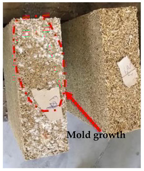 The moisture content of rapeseed straw used in a building must be less than 15% [59] and each batch of this work fulfills this requirement. The average moisture content of M15 and S16 was between 5 and 6%, which is a low value for plant-based materials, and Marne 16 had the highest value (close to the limit of 15%). It should also be noted that the climate and storage conditions have a direct effect on the moisture content of vegetable aggregates. As previously mentioned, this difference in the M16 is undoubtedly due to the development of mold in this batch.