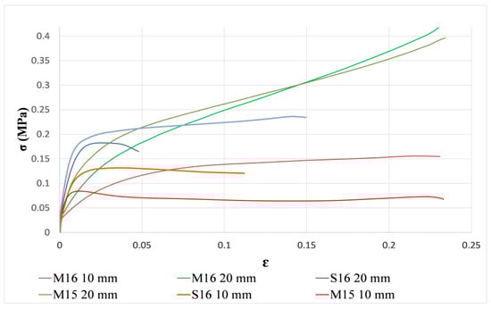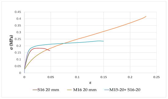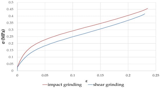 Figure 13 exhibits the mechanical properties of rapeseed concrete produced using M16-20 aggregates and impact and shear grinding techniques. It was observed that the mechanical strength curves for both types of grinding have the same form, with no variation between the elastic and plastic regions, and no failure was detected.