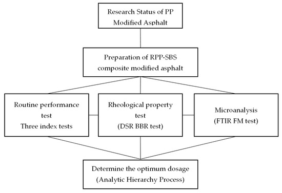 The purpose of this paper is to make use of the advantages of RPP that can significantly enhance the high-temperature rutting resistance and temperature sensitivity of asphalt, and SBS that can enhance the low-temperature toughness of asphalt to produce RPP/SBS composite modified asphalt with better high- and low-temperature performances. Three index tests, the dynamic shear rheology test and the bending beam, creep stiffness test, were performed to analyze the improvement of RPP and SBS at the high and low temperatures of base asphalt under different scenarios. In particular, the modification and compatibility mechanisms were analyzed at the micro level through infrared spectrum scanning and fluorescence microscope tests. The comprehensive performance index of modified asphalt with different RPP contents under typical traffic environment conditions in Northeast China was calculated by combining various properties of modified asphalt with an analytic hierarchy process, and the modifier content was optimized to determine the optimal RPP content with quantitative indicators. This study promotes the application of waste plastics in road engineering and environmental protection and can help to reduce waste and save costs. The specific research method of this study is listed in Figure 1.