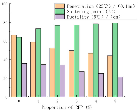 The penetration (25 °C), softening point and ductility (5 °C) of modified asphalt was tested according to the relevant requirements and test methods of the Standard Test Methods of Bitumen and Bituminous Mixtures for Highway Engineering (JTGE20-2011). Figure 9 depicts the influence of RPP content on the three indicators of modified asphalt.