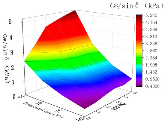 DSR testing was performed to determine the complex shear modulus G*, phase angle sin δ, and rutting factor G*/sin δ. The complex shear modulus G* is a measure of the total resistance of materials during repeated shear deformation. The larger the values of G*, the greater the stiffness of asphalt, the better its high-temperature stability and the stronger its ability to resist flow deformation. The larger the value of G*/sin δ, the better the rutting resistance of RPP/SBS composite-modified asphalt at high temperatures [32]. Based on the statistics of the temperature scanning results of modified asphalt at 64–82 °C (Table 4), the high-temperature performance of asphalt is analyzed by plotting Figure 10 and Figure 11 and Table 4 and Table 5 with temperature and RPP content as the independent variables.