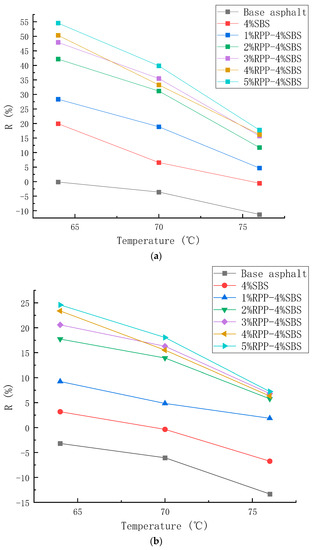 Figure 12 reveals that under the two stress conditions, the R-value of the modified asphalt increases with the RPP content while the Jnr value decreases. This indicates that the addition of RPP changes the viscoelastic properties of the asphalt, enhancing the elastic recovery performance of the modified asphalt and reducing the viscous deformation. Moreover, at the RPP content of 1% and 2%, the viscoelastic properties are observed to improve significantly, while at the RPP content of 3–5%, the viscoelastic properties slightly improve. The test results are consistent with the temperature scanning observations.