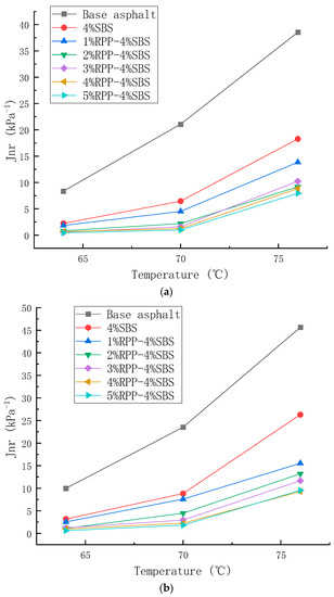 Changes in the unrecoverable creep compliance of asphalt with temperature under different stress levels. (a) 0.1 kPa, (b) 3.2 kPa.