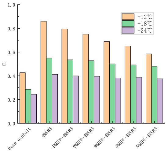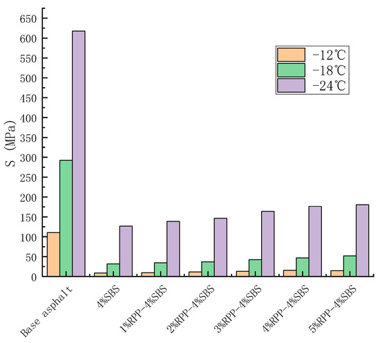 BBR tests can characterize the influence of RPP content on the low-temperature creep performance of asphalt. The creep properties of modified asphalt with different RPP contents of −12 °C, −18 °C and −24 °C were tested by the BBR, with a stiffness modulus and creep rate 60 s. Stiffness modulus refers to the low-temperature cracking resistance of asphalt. The smaller the value of , the better the low-temperature performance of asphalt. Creep rate m represents the stress relaxation ability and sensitivity of asphalt binder stiffness with time. The larger the creep rate , the stronger the cracking resistance of asphalt at low temperatures. Figure 14 and Figure 15 present the change trends of and for RPP/SBS composite-modified asphalt with RPP content, respectively.