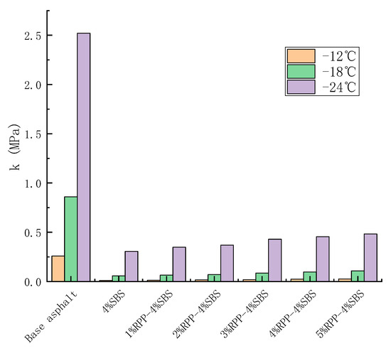 At the same temperature, the lower the stiffness modulus of modified asphalt, the higher the creep rate, indicating the better low-temperature performance of asphalt. Thus, the lower the k value, the better the low-temperature cracking resistance and relaxation ability of asphalt. Taking −18 °C as an example, we calculate the values of matrix asphalt, SBS-modified asphalt and RPP/SBS composite-modified asphalt under different RPP contents (Figure 16).