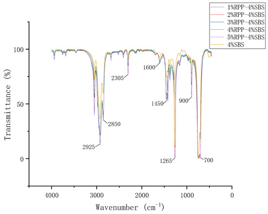 The modified asphalt samples were dissolved in dichloromethane to produce a 10% solution. The effects of the different RPP modifier dosages on the chemical composition and functional groups of SBS-modified asphalt were evaluated by Fourier transform infrared spectroscopy (FTIR) (Figure 7) at a 4 cm−1 resolution, the number of scans was 32, and the wavenumber test range was 4000 to 400 cm−1 [30].